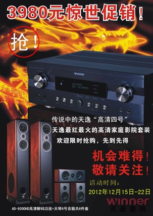 綜合評述:經(jīng)過近段時間與天逸高清4號相濡以沫的磨合,小編深感這是一套性能前衛(wèi)、有強大高清解碼功能和足夠功率、價格物美、很多工薪族家庭都能承受的家庭影院系統(tǒng),尤其在售價方面,天逸推薦的套裝似乎更具有超高的性能價格比,根據(jù)天逸廠家市場部通知,該套功放將在2013年元旦前夕(2012年12月15日---9月22日)廠家將組織一批“高清四號”套裝,以最優(yōu)惠的零利潤價格回報廣大支持民族工業(yè)、支持天逸音響的朋友們,每套售價僅售3980元,先到先拍先得,售完即止!因此關注并想要擁有天逸“高清四號”的朋友們這回可要抓住大塊朵頤的機會,享受天逸這次空前優(yōu)惠促銷的饕餮盛宴了。