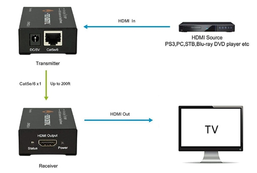 實(shí)體布局以及設(shè)置跟采用網(wǎng)線延長的方法類似。HDMI信號端連接到一個(gè)發(fā)射器端,把HDMI信號轉(zhuǎn)換成光纖或者同軸信號,傳遞到接收端,再轉(zhuǎn)換回HDMI信號。