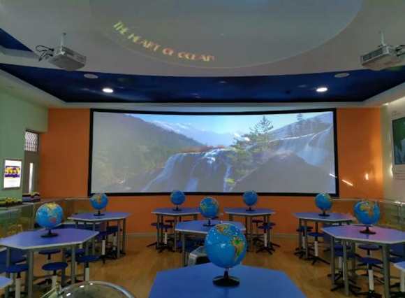 位于教室后方的是一塊幾乎占據(jù)整個(gè)墻面的大屏幕,名為環(huán)幕示教系統(tǒng),顧名思義,以視頻進(jìn)行示范教學(xué)。在教學(xué)實(shí)踐中,教師使用超大屏幕播放相關(guān)視頻,激發(fā)學(xué)生學(xué)習(xí)興趣,引導(dǎo)課程進(jìn)度。與天花板上的天文演示穹頂相輔相成,將學(xué)生全方位地包裹進(jìn)地理學(xué)習(xí)的情境之中。