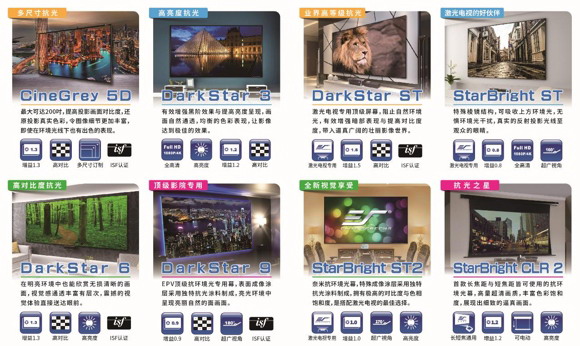 此次億立影視科技展示了CineGrey 5D,DarkStar 3, DarkStar 6, DarkStar 9 DarkStar ST, StarBright ST,StarBright ST2,StarBright CLR2 共八款抗光幕。