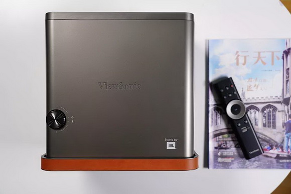 簡潔的頂部只有正中間“ViewSonic”的英文logo以及右下角JBL的logo,顯而易見,優(yōu)派X10-4K的高品質音箱來自JBL。而左下角偏上一點是一枚可以旋轉的帶著同心圓紋理實體按鈕,這顆按鈕起著電源鍵和音量鍵的作用,同時邊上還有兩顆指示燈,顯示著投影儀和藍牙音箱兩種工作模式。