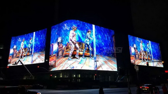 該顯示屏面積1600平方米,結(jié)構(gòu)呈L型,轉(zhuǎn)角處半徑小于3米的弧面均采用上海三思自主研發(fā)的特制顯示模塊,攻克了弧形轉(zhuǎn)角屏“整屏無縫銜接”的技術(shù)難關(guān),以2500萬超高像素成為紐約時代廣場上乃至全球分辨率最高的廣告屏,被業(yè)主稱為“最好的顯示屏”,也是目前上海三思在時代廣場最大的顯示屏。
