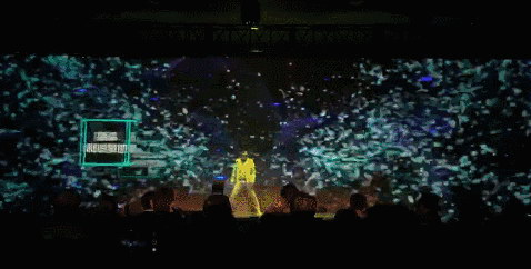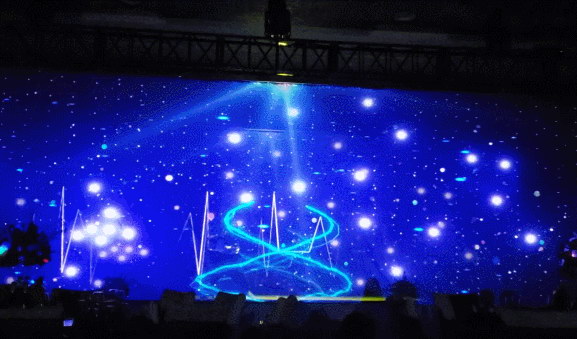 年會現(xiàn)場,鴻合工程顯示團隊通過一臺NEC PH3501QL+工程投影機將動態(tài)視頻投射到紗幕上,優(yōu)秀投影畫質(zhì)與紗幕既反光又透光的特性完美融合,呈現(xiàn)沉浸式的絢麗畫面,配合藝術(shù)家精湛的舞姿,可謂藝術(shù)與高科技的完美結(jié)合,為觀眾打造了身臨其境的沉浸式體驗。