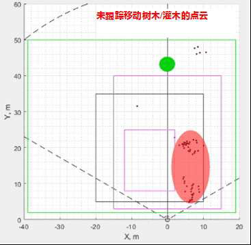 圖 2:來自室外入侵應(yīng)用的動畫點(diǎn)云。黑點(diǎn)表示移動的對象,包括人、樹木、灌木。該算法將人顯示為綠色,同時(shí)過濾掉其他移動對象