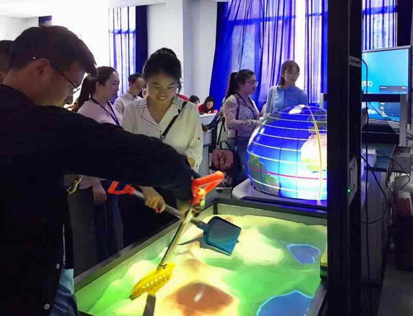 AR地理沙盤是一款寓教于樂的教學(xué)設(shè)備,可以實現(xiàn)投影的成像隨著沙堆高度的改變而呈現(xiàn)不同的地形地貌,還可模擬降雨、火山爆發(fā)等地理活動。學(xué)生們在“堆沙子”的過程中,輕松學(xué)習(xí)等高線、分水嶺、集水區(qū)等知識點內(nèi)容。