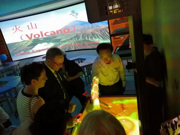 代表團正在體驗的是AR地理沙盤,這是一款寓教于樂的師生互動教學(xué)設(shè)備?梢詫崿F(xiàn)投影的成像隨著沙堆高度的增加而逐漸呈現(xiàn)大陸架、海岸、陸地、湖泊、河流、山丘、雪山等地貌。讓學(xué)生在有趣的動手實驗中,輕松學(xué)習(xí)等高線、集水線等教學(xué)難點。