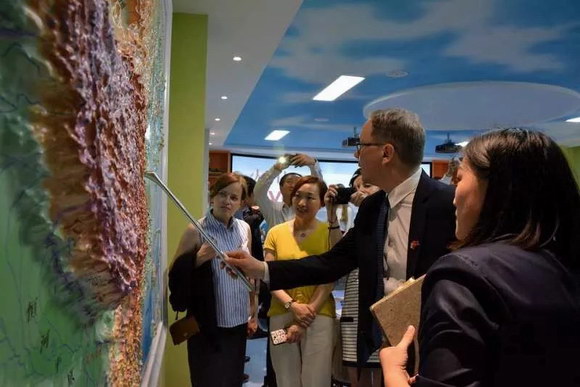 上圖為代表團在體驗語音立體地圖,手中的點讀教鞭點到指定位置,就會播放相應(yīng)的語音解說,不僅在課堂上是老師的好幫手,在課后也能隨時為學(xué)生們解惑。采用立體地形圖的設(shè)計,圖中的地勢地形、山川河流一目了然,使學(xué)生對地圖的記憶更深刻。