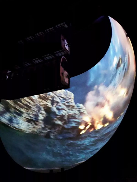 絲路探險(xiǎn)區(qū)的“鄭和寶船”外觀仿造中國明代著名航海家鄭和下西洋時(shí)期的巨船,在船頭與船尾的仿真船艙內(nèi)分別設(shè)有2套碗幕沉浸影院,通過全方位模擬電閃雷鳴、狂風(fēng)驟雨下逼真的特效影像。該方案在寬達(dá)23米的幕上由1臺NEC 40000LM激光工程投影機(jī)+定制魚眼鏡頭投射影像,取代了之前多機(jī)位融合的方案,不僅僅能保證畫面的一致性,并且省去了大量的后續(xù)維護(hù)成本,是目前大型球幕、碗幕非常理想的解決方案。