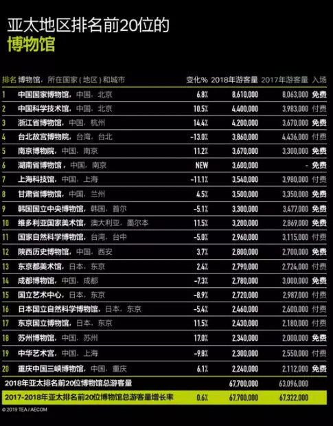 雖然全球市場(chǎng)波動(dòng)不大,但2018年中國(guó)博物館游客量表現(xiàn)突出。北京的中國(guó)國(guó)家博物館持續(xù)在亞太前20博物館排行榜上位列第一,年內(nèi)游客量達(dá)860萬(wàn)人次。另有三座中國(guó)博物館今年首次進(jìn)入前20榜單,且多個(gè)中國(guó)博物館實(shí)現(xiàn)了兩位數(shù)游客量增長(zhǎng),這意味著中國(guó)政府在大力投資和提升大眾文化欣賞品味和水平的舉措卓有成效。