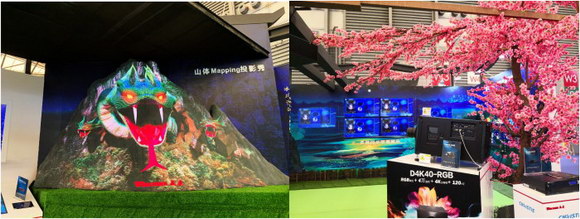 展位的中間是一個(gè)立體山體模型,贏康通過(guò)科視D4K40-RGB投影機(jī),在該山體上投映出《天馬戀》主題視頻。該投影機(jī)是科視最新推出的真激光投影機(jī),可達(dá)到無(wú)與倫比的色彩還原度和4萬(wàn)流明亮度,精準(zhǔn)還原視頻的真實(shí)效果。影片內(nèi)容由贏康獨(dú)立策劃制作完成,配合夜游演出的主題,讓觀眾在現(xiàn)場(chǎng)感受自然山體投影帶來(lái)樂(lè)趣與精彩。
