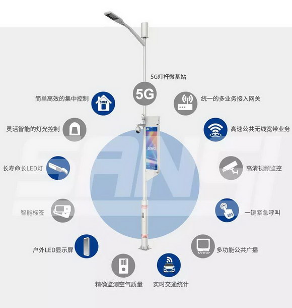 智慧路燈采用“共享燈桿”的方式,集成了公共WiFi、視頻監(jiān)控、公共廣播、溫度監(jiān)測(cè)、濕度監(jiān)測(cè)、風(fēng)速監(jiān)測(cè)、空氣質(zhì)量監(jiān)測(cè)、緊急呼叫、信息發(fā)布等功能。