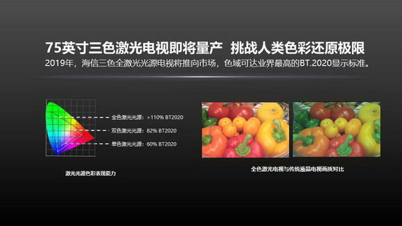 據(jù)介紹,海信自主研發(fā)的三色激光電視也叫全色激光電視,其所有的顏色均由激光產生,沒有任何色輪的補充,能夠輕松達到業(yè)內最高的BT.2020標準,色彩表現(xiàn)力超過了人類已知的其他顯示方案,可以最大程度地還原自然色彩!霸谶\用三色激光顯示技術同時,這款電視也是業(yè)界首次將激光電視下探到75吋,技術難度超乎想象! 高玉嶺表示。