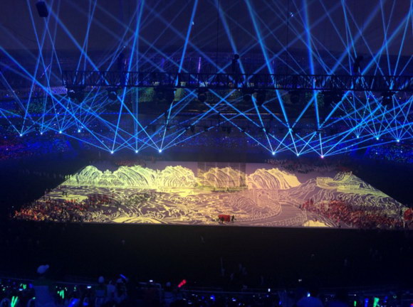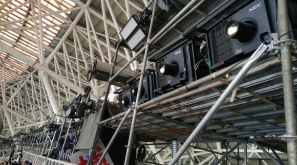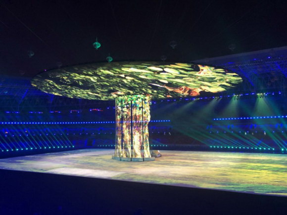 本屆青會(huì)開幕式突破傳統(tǒng)觀演模式,首次打造空中+立面+地面全景立體影像呈現(xiàn)效果,實(shí)現(xiàn)橫向360度+縱向360度的720度視覺奇跡。由34臺(tái)NEC 4萬流明、4K雙色激光工程投影機(jī)參與打造。
