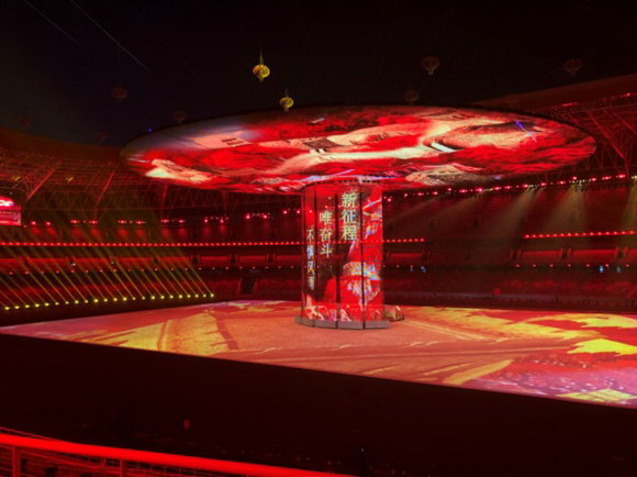 二青會(huì)開幕式突破傳統(tǒng)的觀演模式,吊裝直徑80米、面積達(dá)5024平方米的巨型天幕,首次在空中呈現(xiàn)影像內(nèi)容,與地面影像互動(dòng)和半透明圓形紗幕投影融合,延展表演空間,實(shí)現(xiàn)720°視覺效果和沉浸式演出,帶給觀眾超級(jí)震撼的視覺體驗(yàn)。