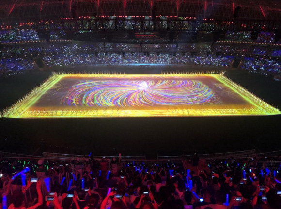 開幕式歷來都是大型運(yùn)動(dòng)會(huì)上備受關(guān)注的焦點(diǎn),本屆青會(huì)開幕式突破傳統(tǒng)觀演模式,首次打造空中+立面+地面全景立體影像呈現(xiàn)效果,實(shí)現(xiàn)橫向360度+縱向360度的720度視覺奇跡。由34臺(tái)NEC 4萬