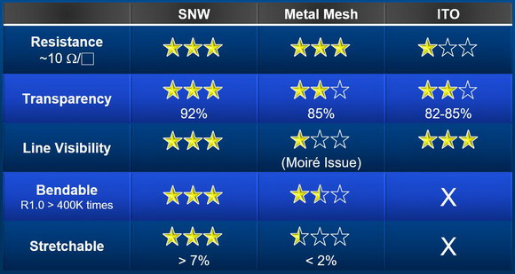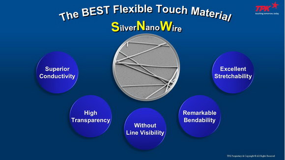 吳博士提到,TPK選擇納米銀主要是因?yàn)榧{米銀擁有優(yōu)良導(dǎo)電性外,還具有優(yōu)異的透光率和可撓性,是柔性觸控屏最佳的材料。