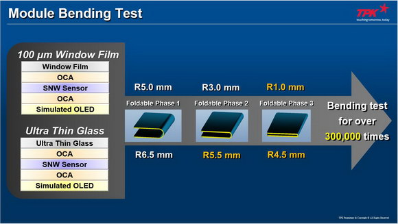 TPK針對觸摸屏迭構(gòu)上,不管是可折疊手機(jī),或者是接下來要選擇的Cover film的材料,這些搭配性上,納米銀都有辦法可以滿足,并且也能承受超過30萬次的彎折。