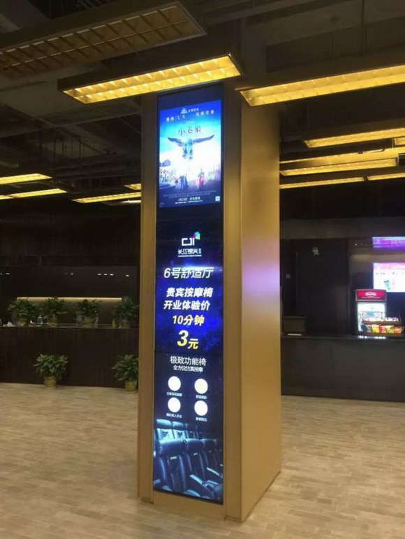 數(shù)字標(biāo)牌采用內(nèi)嵌式安裝,與影院大廳的承重柱“融為一體”,不僅可節(jié)省安裝空間,還能輕易聚焦用戶目光。實(shí)際運(yùn)用中,