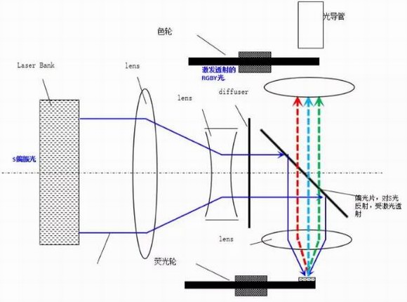 技術(shù),將短波藍色激光通過波長轉(zhuǎn)換裝置轉(zhuǎn)換成紅色熒光、綠色熒光與長波藍色熒光,實現(xiàn)了激光熒光光源的紅、綠、藍三基色全部為熒光,完全沒有激光成分以及短波藍光。