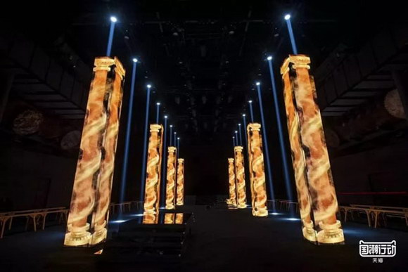 天貓潮童秀以經典動畫《大鬧天宮》為靈感,結合前沿科技打造了一場先鋒科幻的創(chuàng)意秀。由八根全面屏LED光柱,以中國傳統(tǒng)建筑講究對稱的工整格局,打造美輪美奐的天宮舞臺。