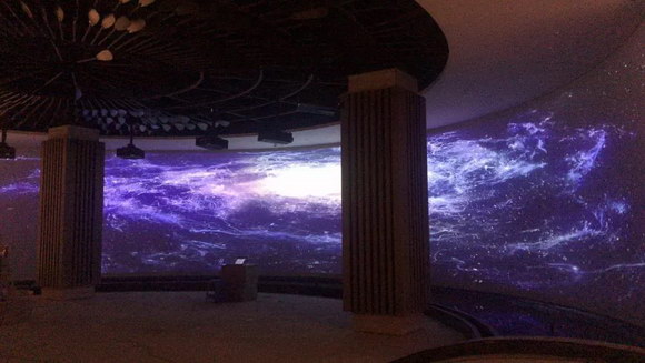 國(guó)畫激光投影機(jī)為東方文華酒店主題大屏提供了5*1的融合方案,采用5臺(tái)國(guó)畫高性價(jià)比7000lm激光工程投影機(jī)(LP70US)配合短焦鏡頭,打造弧長(zhǎng)23.7米,高度3米的弧形展示屏。