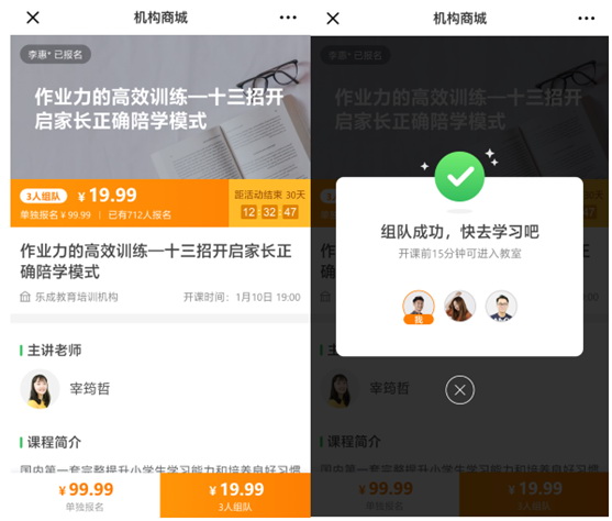 教培機構(gòu)的流量來源受制于管理者的人脈,信鴿機構(gòu)版打造一系列營銷工具為管理者提供了更多選擇。如“組隊聽好課”功能,吸引潛在用戶帶動身邊的流量資源一起試聽,激活每一個用戶的私域流量池,很好地讓流量產(chǎn)生裂變效應(yīng)。