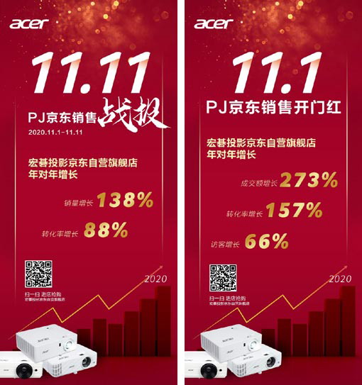 2020“只為熱愛行動”為主題的京東11.11全球熱愛季已圓滿收官;顒悠陂g,宏碁投影誠意滿滿,攜眾多高品質(zhì)家用商用投影機和犀利福利強勢而至,為消費者帶來了一場鉅惠盛宴。雙十一大促期間(11.1-11.11)宏碁投影京東自營旗艦店銷售表現(xiàn)亮眼,年對年銷量增長138%,轉(zhuǎn)化率增長88%。11月1日當(dāng)天,銷量更是異軍突起呈現(xiàn)開門紅,成交額增長273%,轉(zhuǎn)化率增長157%,訪客增長66%。