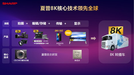 享有“8K之父”美譽(yù)的夏普,不僅已在8K技術(shù)上深耕二十余年,還率先將“8K+5G”提升到了戰(zhàn)略高度,積極推動(dòng)“8K+5G”生態(tài)鏈布局落地,F(xiàn)如今,夏普8K生態(tài)系統(tǒng)已完成在軟硬件方面的全面升級,形成獨(dú)有的8K+5G解決方案。夏普還在硬件上發(fā)布了更多頂尖技術(shù)產(chǎn)品,含全球最大的120英寸8K電視、第三代民用級8K電視、8K 攝影機(jī)、8K 消費(fèi)級編輯主機(jī)以及夏普全球首部8K+5G 手機(jī)等。