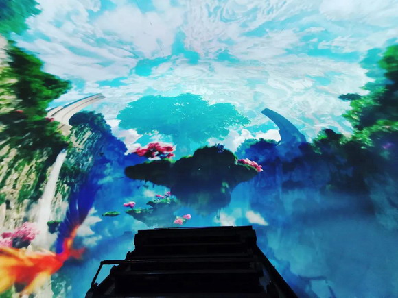 在艙內坐定后,游客立刻被全包裹的投影畫面所震驚,6K60幀高品質的立體影片從腳底到四周再到頭頂,覆蓋了眼之所及的各個角落,高度沉浸的效果讓游客掙脫了座位的束縛,仿佛置身影片之中。
