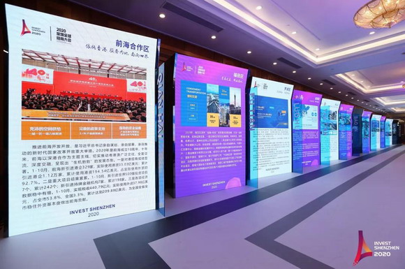 走廊一側的12塊大屏,圖文并茂的展示著前海合作區(qū)及各區(qū)(新區(qū))、深汕特別合作區(qū)等12大行政區(qū)的招商政策、營商環(huán)境及招商成果。