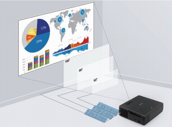 另外,對(duì)于會(huì)議室投影來說,除了清晰高質(zhì)量的畫面輸出以外,更大的投影畫面也必不可少。EF-11可以實(shí)現(xiàn)短距離大畫面投影,投射比僅 1.0:1, 根據(jù)會(huì)議室大小,畫面大小輕松調(diào)節(jié),收放自如,僅需 2.24 米即可得百英寸大畫面,視野更廣,體驗(yàn)更真實(shí)。