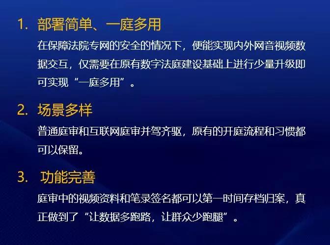 不僅庭審過程流暢,操作簡便,當事人使用微信即可參與庭審,支持此次線上庭審的系統還有如下優點: