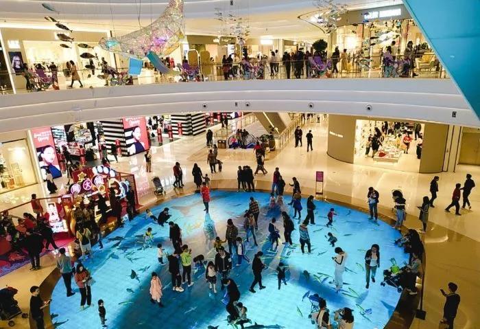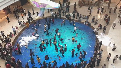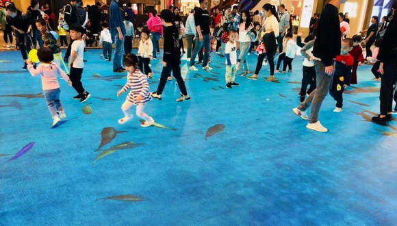 當(dāng)人們走過時(shí),地上的海洋精靈仿佛有所感應(yīng),四散游去。小孩子們則開始了一場(chǎng)追逐地上游動(dòng)小魚的游戲,嬉戲打鬧中,享受著愉快的親子時(shí)光。