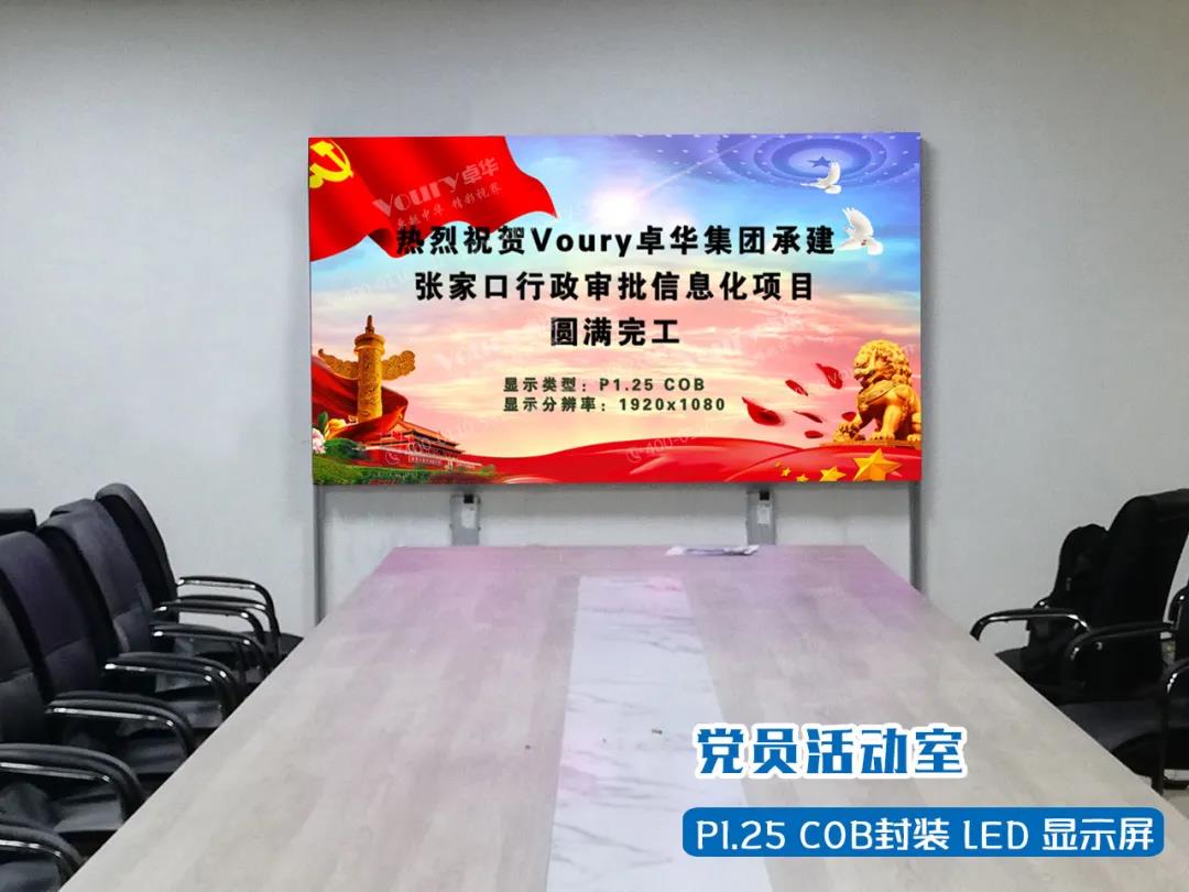 為進(jìn)一步加強(qiáng)黨支部的陣地建設(shè),提高基層黨支部工作的科學(xué)化和規(guī)范化水平。Voury卓華ZHVW-12C系列COB封裝LED顯示屏應(yīng)用于張家口市行政審批局黨員活動室,以其無縫拼接、超高對比度、超高刷新率、豐富顯示色彩等調(diào)試效果,受到各位領(lǐng)導(dǎo)的一致好評,有效提升拼接屏幕的易用性,提升黨員使用體驗(yàn)。