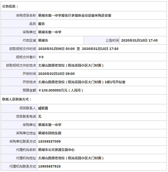 采購項(xiàng)目名稱: 赫章縣教育科技局采購赫章縣17所學(xué)校錄播教室設(shè)備項(xiàng)目 采購品目: 預(yù)算金額: ¥510.000000萬元(人民幣) 獲取招標(biāo)文件時間: 2020年03月19日 08:30 至 2020年03月25日 17:30 獲取招標(biāo)文件地點(diǎn): 登錄畢節(jié)市公共資源交易中心交易系統(tǒng)報名后下載;開標(biāo)時間: 2020年04月08日 09:00 開標(biāo)地點(diǎn): 畢節(jié)市公共資源交易中心評標(biāo)室; 項(xiàng)目聯(lián)系人: 陳女士 項(xiàng)目聯(lián)系電話: 13035549999