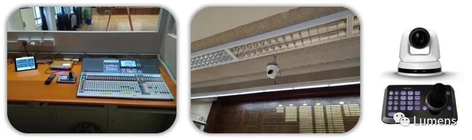 三臺(tái)Lumens超高清會(huì)議攝像機(jī)VC-BR70H安裝在學(xué)校大廳,以捕捉學(xué)校進(jìn)行的現(xiàn)場(chǎng)表演。攝像機(jī)連接到切換器,圖像通過(guò)投影儀顯示。
