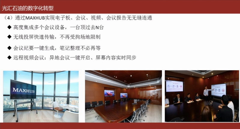 高洪軍分享了光匯石油如今的數(shù)字化會議場景:借助高度集成多個會議設(shè)備功能于一體的MAXHUB會議平板,光匯石油一改以往開會需要接線復(fù)雜的多個設(shè)備夾在一室的混亂場面,一臺頂過去N臺,無論本地會議、遠程視頻會議都可以一鍵開啟。電子白板、視頻、會議報告無縫銜接,搭配無線傳屏、生成會議紀(jì)要等功能,讓整個會議高效、高質(zhì)量進行,會議系統(tǒng)的升級讓光匯石油快人一步實現(xiàn)了辦公數(shù)字化升級。