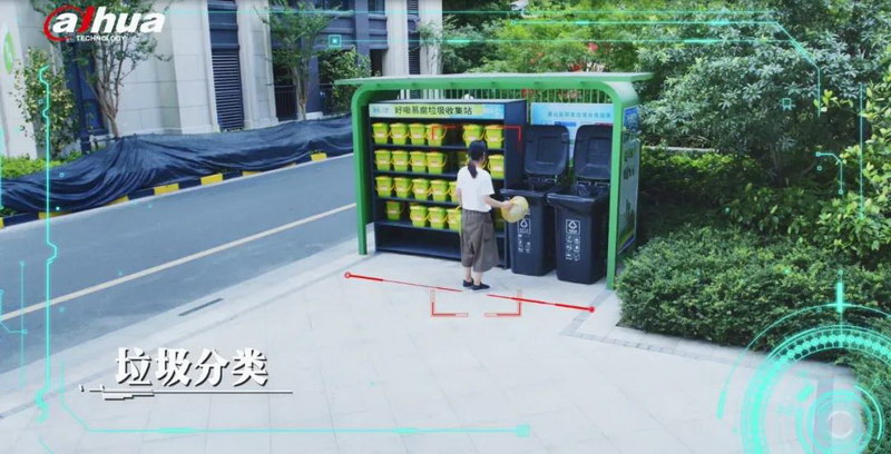 垃圾分類:在小區(qū)垃圾分類投放點布署大華智能攝像機,當有居民投放垃圾時,觸發(fā)人體檢測,聯(lián)動聲音、白光預警提醒,引導居民分類投放,幫助居民養(yǎng)成垃圾分類投放的生活習慣。
