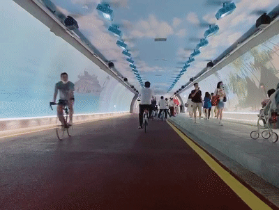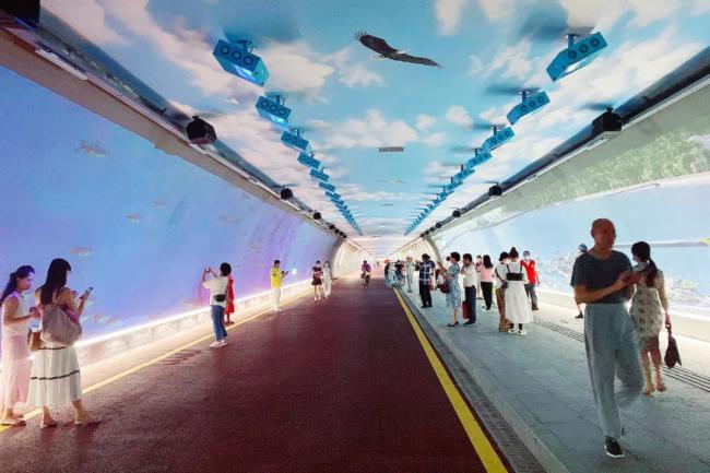 來到慢行隧道中段,長約50米、高4米的巨幕投影畫卷般鋪展于兩側(cè)。美麗靜謐的海底世界、珠海引以為傲的大橋、日新月異的城市變化,在隧道內(nèi)邊散步邊領(lǐng)略珠海城市“大片”。
