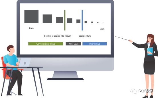 MicroLED ,其實(shí)這里Micro是更微小的意思而并不指具體尺寸。目前我們用的長(zhǎng)度的法定計(jì)量單位在小于1毫米后一般依然用毫米為單位如0.01mm,但到了小于0.01mm時(shí)往往就會(huì)用微米即0.01mm=10um。當(dāng)然,如直接將0.1mm寫(xiě)成100um也是正確的,這就好比可把1cm寫(xiě)成10000um是一個(gè)道理。這也是造成了目前對(duì)Micro LED尺寸定義混淆的原因。