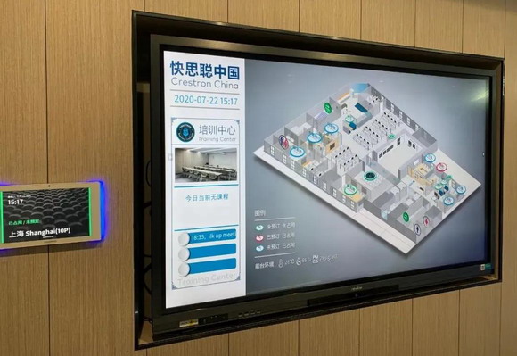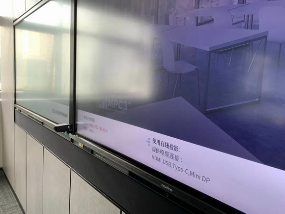 儀式結(jié)束后,受邀嘉賓們分組參觀了嶄新的辦公室。前臺(tái)映入眼簾的是一塊newline智能交互平板,作為導(dǎo)覽及互動(dòng)使用。此屏可以和快思聰中控及預(yù)約平臺(tái)對(duì)接,實(shí)時(shí)顯示整個(gè)樓層各個(gè)會(huì)議室的狀態(tài),以及會(huì)議室主要功能,如:普通會(huì)議室,音頻、視頻會(huì)議室等。