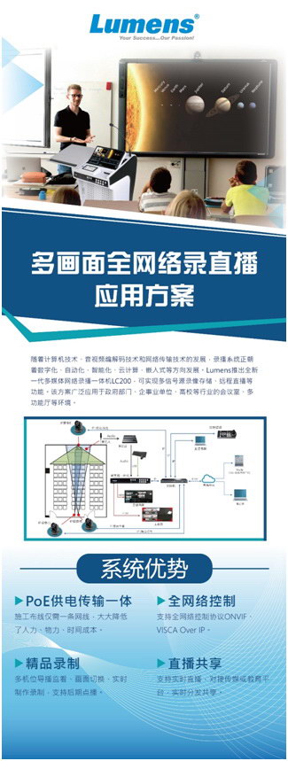 Lumens, 1998年創(chuàng)立,總部位于素有“臺(tái)灣硅谷”之稱的臺(tái)灣新竹市,隸屬和碩集團(tuán)旗下,是和碩集團(tuán)核心成員之一。起源于視頻采集領(lǐng)域的我們,以超過20年不懈研發(fā)、制造、連接、創(chuàng)造的精耕歷史,如今在智能交互多媒體教學(xué)領(lǐng)域,Av視頻會(huì)議集成領(lǐng)域,控制室智能化領(lǐng)域得到長足發(fā)展。其自主研發(fā)生產(chǎn)的高清實(shí)物展臺(tái)、DLP背投機(jī)芯、高清會(huì)議攝像機(jī)、智慧錄播一體機(jī)等產(chǎn)品成功營銷全球40多個(gè)國家,每條產(chǎn)品線市占率皆位居世界前3之列。以“專精尖”特色成為集團(tuán)里熠熠之星。
