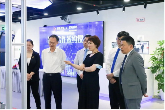 ▲科達(dá)董事長(zhǎng)陳冬根一行參觀創(chuàng)新奇智展廳