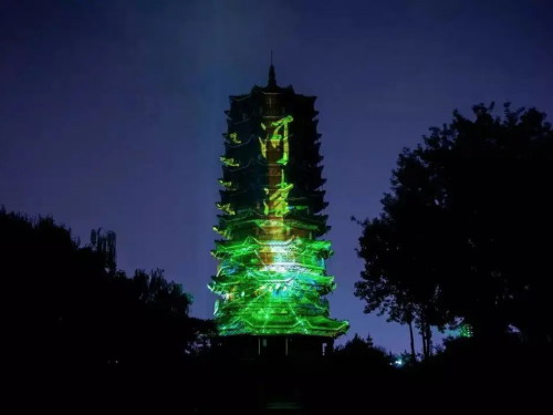 山西河津九龍公園中的九龍塔,是當(dāng)?shù)氐貥?biāo)建筑。夜晚來臨,如夢如幻的九龍塔燈光投影秀開啟,伴隨著音樂,古塔生龍活虎起來,光與影交相輝映,聲與圖相得益彰,再現(xiàn)了河津歷史人文故事。