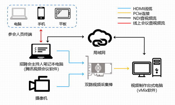 在這個方案中視頻制作和招聘宣講工作分在兩臺電腦上完成,一方面可以幫助主持人不受太多因素干擾,集中精力放在宣講和互動上,另一方面減少單臺電腦運行壓力,實現穩(wěn)定可靠的線上招聘。美樂威采集卡能廣泛兼容信號源,其自動檢測輸入信號的功能適合各種類型用戶使用。當然根據用戶演播室的大小,實際需要接入視頻的通道數,美樂威還有更多產品等您發(fā)掘!