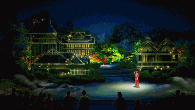 不同于以往的夜游項(xiàng)目,『奇妙·夜德天』是將自然風(fēng)光、歷史文化、燈光藝術(shù)與視聽技術(shù)實(shí)現(xiàn)最完美融合的夜游盛宴;诖耍鳛檎麄(gè)景區(qū)夜游項(xiàng)目的總制作、總實(shí)施單位,利亞德集團(tuán)旗下勵(lì)豐文化,歷時(shí)2年深入當(dāng)?shù)赝诰蛎褡逦幕,潛心調(diào)研消費(fèi)需求,最終還原出當(dāng)?shù)叵让竦纳钸z跡。
