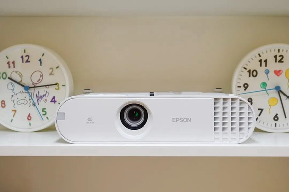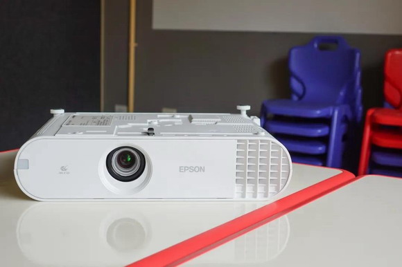 機(jī)身正面看,除了投影鏡頭和愛普生logo外,沒有其他花哨的設(shè)計,而且這款投影機(jī)采用了圓潤的曲線設(shè)計,即使不采用吊裝,放置在桌面上,也盡量避免了孩子磕碰到產(chǎn)品堅硬棱角的情況。