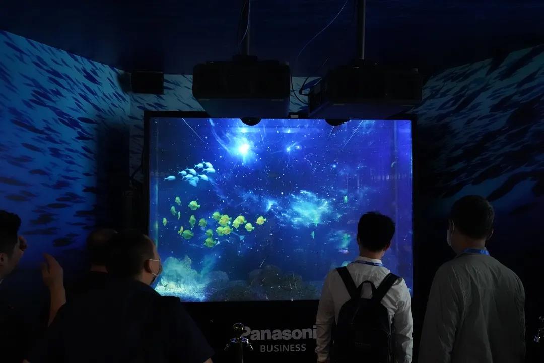 展項利用高亮度松下激光光源工程投影機,投射出繽紛多彩的海底世界,虛擬的影像配合真實魚兒的互動,營造出生動有趣、新奇獨特的陳列展示效果。