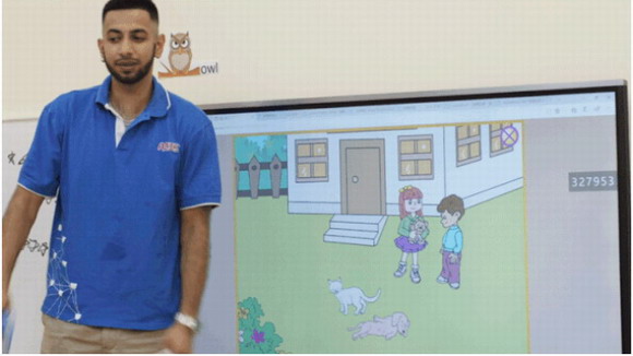 “因為愛貝的學生用書的是比較小的,如果在實際的課堂當中,把課本直接展現(xiàn)給小朋友看,可能會出現(xiàn)看得不太清晰的情況!比缃,Miya會把課程動畫導入希沃一體機,讓每個小朋友都看清所學知識,通過小故事引入,順利展開情景教學!斑@樣一來,我們今天要上的什么內(nèi)容,小朋友可以很清楚地知道了。 ”