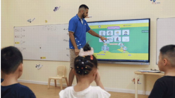 “我會用希沃播放視頻,讓孩子們跟著視頻一起唱歌。這是另一種快速學習英語的方式。我還會帶他們在屏幕前玩玩小游戲,確保他們不會坐太久,并在課堂上保持活躍!蓖饨蘇adir表示。Kadir來自美國,在他的課堂中,總是充滿著孩子們銀鈴般的笑聲,大家時而跟著他喊出英語,時而被他小動作逗笑。如今,他和Miya合作的英語課,成為敲開孩子和家長“心門”的金牌試聽課。